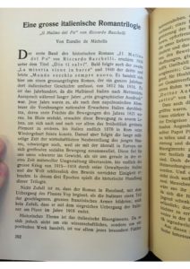Si tratta della traduzione in tedesco dell’articolo di Euralio de Michelis sulla trilogia di Riccardo Bacchelli Il mulino del Po. La traduzione dall’italiano è di Hedwig Kehrli