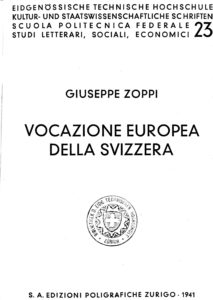 Note: 'Vocazione europea della Svizzera' fu il titolo della conferenza tenuta da Giuseppe Zoppi di fronte agli studenti, alle studentesse e al corpo docenti del Politecnico di Zurigo il 29 novembre 1940. Il testo della conferenza venne pubblicato presso le Edizioni Poligrafiche nel 1941.